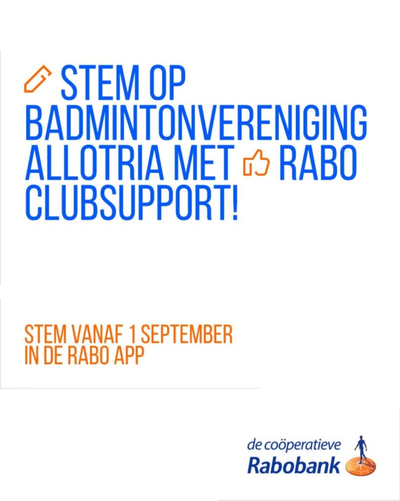 Help Allotria aan een mooie financiële bijdrage! Als je klant bent bij de Rabobank kun je stemmen op de club via de Rabo Clubactie. Des te meer stemmen we krijgen, des te hoger de het geldbedrag dat we krijgen. Stemmen gaat via je eigen Rabo Bankieren app!